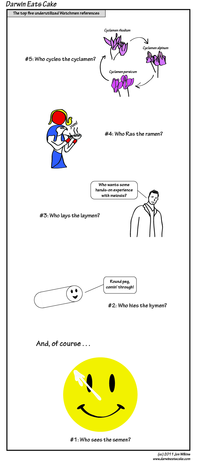 So, here we are, five days after celebrating Darwin Eats Cake’s birth, and the little comic that could has just received its first piece of fan art. To set the stage, here is Darwin Eats Cake number 88 — The top five underutilized Watchmen references: