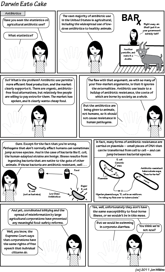 Anyway, here’s a strip that appeared last year at Darwin Eats Cake, where Andy and Eleonora debate the use of antibiotics in agriculture. It’s from back before I increased the font size, so it is easier to read on the original site.
