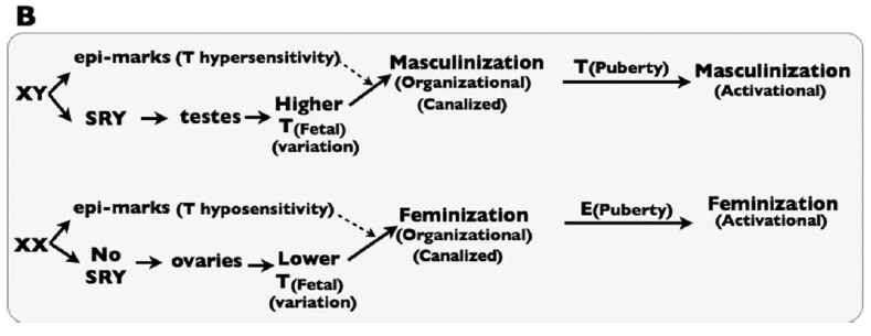 Sex-specific development is thus canalized by some sort of mechanism that they refer to generically as “epi-marks.” That is, they imagine that there must be some epigenetic differences between XX and XY fetuses that encode differential sensitivity to Testosterone.