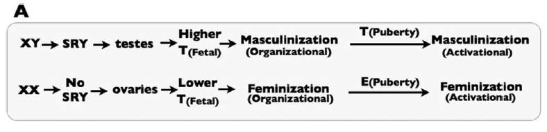 | Figure 1A from the paper: a simplified picture of the “classical” view of sex differentiation. T represents testosterone, and E represent Estrogen. |