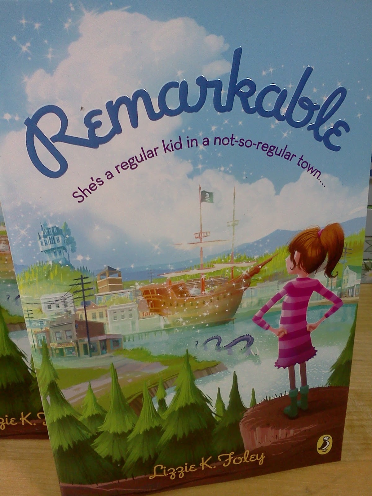 So, guess what came in the mail yesterday? That’s right! It’s the paperback edition of Remarkable, by Lizzie K. Foley. The hardback came out last April under the Dial imprint of Penguin. The paperback is through Puffin (also part of Penguin), and has a completely new cover. Here’s a stack of them: